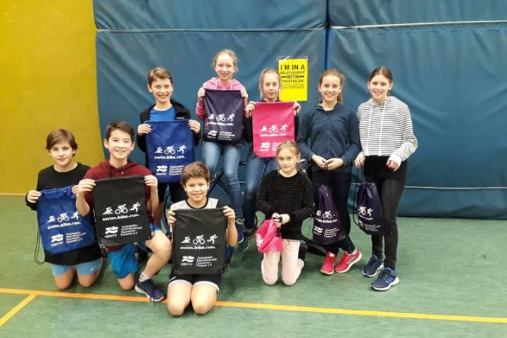In der Aula wurden ihnen unter großem Beifall die Turnbeutel des „Nordrhein-Westfälischen-Triathlon-Verbandes“ ausgehändigt. Natürlich bekamen auch die engagierten SchülerInnen des Projekts am Ende noch einen Beutel, denn sie hatten den Triathlon in der Sporthalle konzipiert, organisiert und erfolgreich durchgeführt!