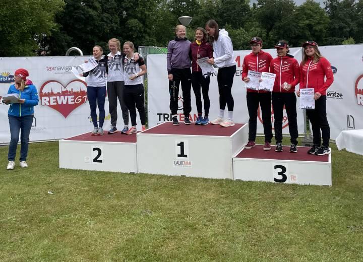 Eine dritte Streckenlänge hatten sich die Organisatoren für die NRW-Ligen ausgedacht: 750 Schwimmmeter, 20 Rad- und 5 Laufkilometer. Dieser Distanzen nahm sich zunächst das „starke Geschlecht“ an. Am Rennende jubelte Svea Lüdorff über ihre Zeit von 1:05:58 Stunden, den Titel „Schnellste NRW-Liga-Dame“ und gemeinsam mit Christina Nüßing und Celina Albanus über den Mannschaftssieg von Tri Speed Marienfeld (Platzziffer 28). Auf die Platzziffer 40 kam das Trio des DLC Aachen II mit Olivia Peel, Josephine Betche und Laura Laermann. Damit steht für sie Platz zwei in der Resultatsliste vor dem EJOT Team TV Buschhütten II. Für dieses waren Gwendolin Rapp, Inga Sauer und Debby Motte erfolgreich mit einer Platzziffer von 48.