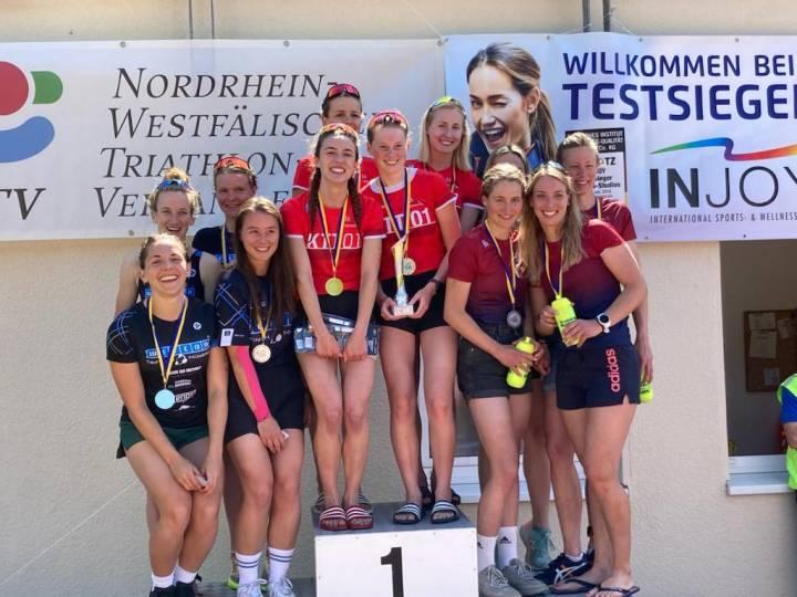 Bei den Damen ging der Siegerpokal in der NRW-Liga nach Köln. Verantwortlich dafür zeichneten Carlota Hellbusch, Marie Miroslaw und Julie Herrmann, die einen spannenden Wettkampf nach 1:22:14 Stunden für sich entscheiden konnten. Acht Sekunden später jubelten auch Katharina Thoma, Franziska Hinte und Leonie Zumhasch. In den Trikots von WEICON Tri Finish Münster holten sie sich die Silbermedaille. Zwei Wimpernschläge dahinter hielt die Uhr für die SSF Bonn Triathlon III an. 1:22:24 Stunden brachten Katja Krägenbring, Berit Bühner und Ronja Steiling ebenfalls auf das Podest.