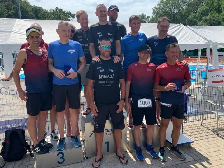 Vor den süßen Geschmack des Triumphes hatten der NRWTV und das Bochumer Organisationsteam noch eine Triathlon-Kurzdistanz gestellt. Mit dieser hielten sich allerdings Masters Uli Salenti, Andre Pabich und Andreas Kiso nicht sonderlich lange auf. „Drei plus vier macht sieben, widewidewitt und fünf macht zwölfe, die SG Armada Würselen/ Team Indeland macht sich die Masters-Welt, widewidewitt, wie es ihr gefällt.“ Rang eins in Bochum.