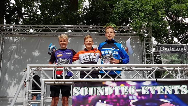 Den Auftakt machten die männlichen B-Jugendlichen und die Schüler A. Siegreich nach 400 Metern Schwimmen, zehn Kilometern auf dem Rad und 2,5 Kilometern Laufen waren A-Schüler Marius Voos (Hildener AT) und Lukas Meckel (PV Triathlon Witten). Voos benötigte 39:56 Minuten und war damit deutlich vor Lukas Kurtenbach (SSF Bonn) und Liam Wittig (Hennefer TV) im Ziel. Lukas Meckel hob nach 35:22 Minuten die Arme jubelnd in die Höhe. Ihm folgten Enno Meden (Brander SV) und Gus Otte (SuS Stadtlohn) auf den Podiumsplätzen.