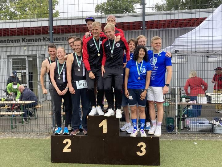 Ein Duathlon-Feuerwerk brannte in Kamen Timo Schaffeld vom SC Rot-Weiß Oberhausen ab. Nach 1:51:33 Stunden beendete er das Rennen der Landesliga Mitte als Erster. Rund sieben Minuten später begrüßte er Niklas Merlin (Remscheid Vital) als Zweitplatzierten. Weitere dreieinhalb Minuten später waren Schaffelds Mannschaftskollegen Sven Gerhards, Bastian Siemes und Kevin Engler bereits im Ziel, addierten 22 Platzziffern und freuten sich über einen überlegenen Saisonsieg. Niklas Merlin kam zusammen mit Felix Ehmke, Leonard Braun und Camila Alfaro Solano auf Platzziffer 78 und Rang drei, da der TSV Solingen einen Tick stärker war. Ingo Klünner, Patrick Humberg, Jannik Schubert und Janine Thasler belohnten sich für ihre Platzziffer 75 mit dem Silberrang.