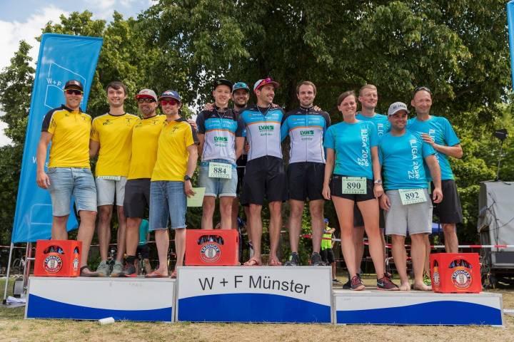 Die Radsportfreunde Borken bewiesen in Saerbeck, dass ihnen auch das Schwimmen und das Laufen großen Spaß bereiten. Recht unangefochten bejubelten Kai Hesterwerth, Adrian Zingler, Simon Malburg und Christoph Stork den ersten Platz in der Landesliga Nord. Ihnen folgte mit der im Vergleich zu den Siegern doppelt so hohen Platzziffer 60 der Marathon Club Menden. Die Sauerländer hatten Hendrik Jansen, Damian Jelonek, Johannes Franke und Michael Nottebohm für die Fahrt in den NRW-Norden nominiert – mit Recht. 109 gemeinsame Platzpunkte vereinten Christoph Berger, Mirco Hammerl, Jörg Wagner und Britta Jungeilges. Damit waren auch die Farben der Tri-As Hamm bei der Sieger*innenehrung vertreten.