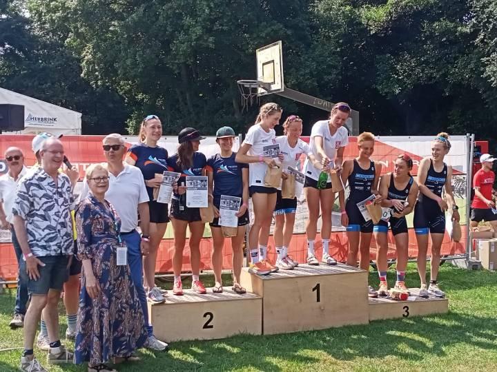 Zurück zum Ernst des Triathlonlebens und somit der Oberliga der Frauen. Und wer drängt sich mal wieder an allen anderen vorbei? Greta Röhrs, Saskia Schmidt und Louisa Wolf sind die Teammitglieder des Kölner Triathlon Teams 01 V. Platzziffer 40 waren gleichbedeutend mit Rang eins vor dem Reeser SC Triathlon. Antonia und Ricarda Beckmann sowie Julia Schweers beendeten ihre Rennen dergestalt, dass sie 58 Platzpunkte hatten und damit über den Silberrang jubeln durften. Bei der Siegerehrung waren sie die einzigen Nicht-Kölnerinnen, denn TriCologne belegte mit Platzziffer 70 Platz drei, wofür Svenja List, Laura Schulenkorf und Antonia Lück verantwortlich zeichneten.