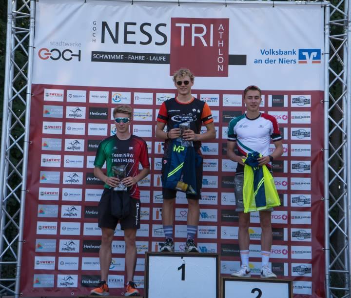 Köln und Bonn waren in gleicher Position auf dem Siegertreppchen der Jugend A vertreten, da David Klein aus der Domstadt und Joshua Felten aus der früheren Hauptstadt einen guten Wettkampf hinter sich bringen konnten. Für den Sieg reichte es indes nicht, da Bruno Krumbeck vom SuS Stadtlohn Triathlon nach 55:46 Minuten das Zielbanner in die Höhe recken konnte.