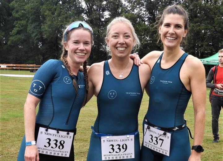 In rheinischer Hand war auch das Damen-Rennen der Regionalliga mit dem besten Ausgang für das Triathlon Team Düsseldorf. Deren Florentine Exner ließ es sich nicht nehmen, in 51:22 Minuten die schnellste Zeit aller Liga-Starterinnen zu erzielen. Ebenso wenig ließ sie es nicht nehmen, mit ihren Teamkolleginnen Sabine Schneider (57:24 Minuten) und Elena Wissing (59:18 Minuten) den Mannschaftserfolg zu feiern. Rang zwei ging an Mach 3 Köln II. Sina Böhne (52:02 Minuten), Maike Terveer 00:54:30 Minuten) und Kim Zwicker (1:01:43 Stunden) sammelten mit Platzziffer 36 ein tolles Ergebnis, hatten aber hauchdünn das Nachsehen gegenüber den 35 Punkten der Landeshaupstädterinnen. Der PSV Triathlon Bonn II mit Inga Radtke (54:56 Minuten), Tina Jensen (59:23 Minuten) und Mona Hillesheim (59:28 Minuten) komplettierte das Siegerpodest.
