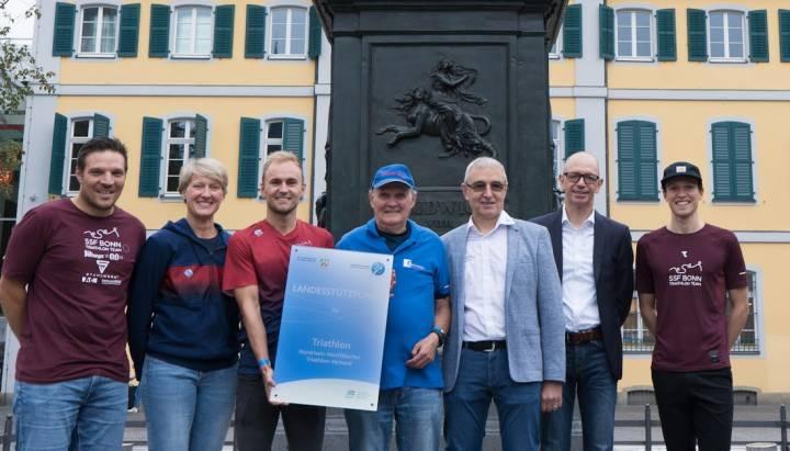 Dieser Event hat sich für die Triathlonabteilung der Schwimm- und Sportfreunde Bonn definitiv gelohnt. Beim vereinseigenen Festival Ende August stand neben der Präsentation aller Vereinsangebote und -sportarten auch der „Schildbürgerstreich“ durch die Verantwortlichen des NRWTV auf dem Programm. Präsident Burkhard Schmidt und Vize-Präsident Klemens Naber übergaben auf dem Bonner Münsterplatz das offizielle Schild, mit welchem sich die SSF als Landesstützpunkt Triathlon präsentieren dürfen.