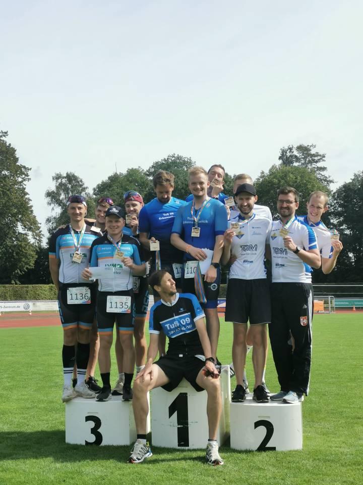 Eines Meisters würdig sicherte sich das Team vom Tricity 2001 e.V., beheimatet in Paderborn, zum Saisonabschluss den Tagessieg. Jonas Orfgen, Florian Magiera, Ajosha Pilot und Joachim Magiera kamen auf eine Platzziffer von 33 – die niedrigste in den Ligaresultaten. Dem Meister-Quartett folgte das 1. Tri Team Gütersloh II. Für dieses waren Mario Radevic, Martin Sandmann, Daniel Buchwald und Julian Oldenburg erfolgreich, alldieweil die vier auch nur wenige Platzpunkte addierten, deren 42. Rang drei ging ins Sauerland. Der Marathon-Club Menden hatte Hendrik Jansen, Johannes Franke, Christian Steinhoff und Martin Itter nach Versmold entsandt. Und womit? Mit Recht, da die Mendener mit Platzziffer 66 zur Siegerehrung anwesend bleiben durften.